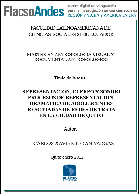Terán Vargas, Carlos Xavier (2012). Representación, cuerpo y sonido: procesos de representación dramática de adolescentes rescatadas de redes de trata en la ciudad de Quito. Maestría en Antropología Visual y Documental Antropológico; Flacso sede Ecuador. Quito, 96 p.
