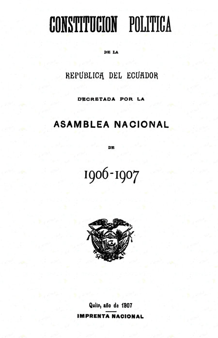 1907. Constitución política de la República del Ecuador decretada por la Asamblea Nacional de 1906-1907. Quito, Ecuador : Imprenta Nacional.