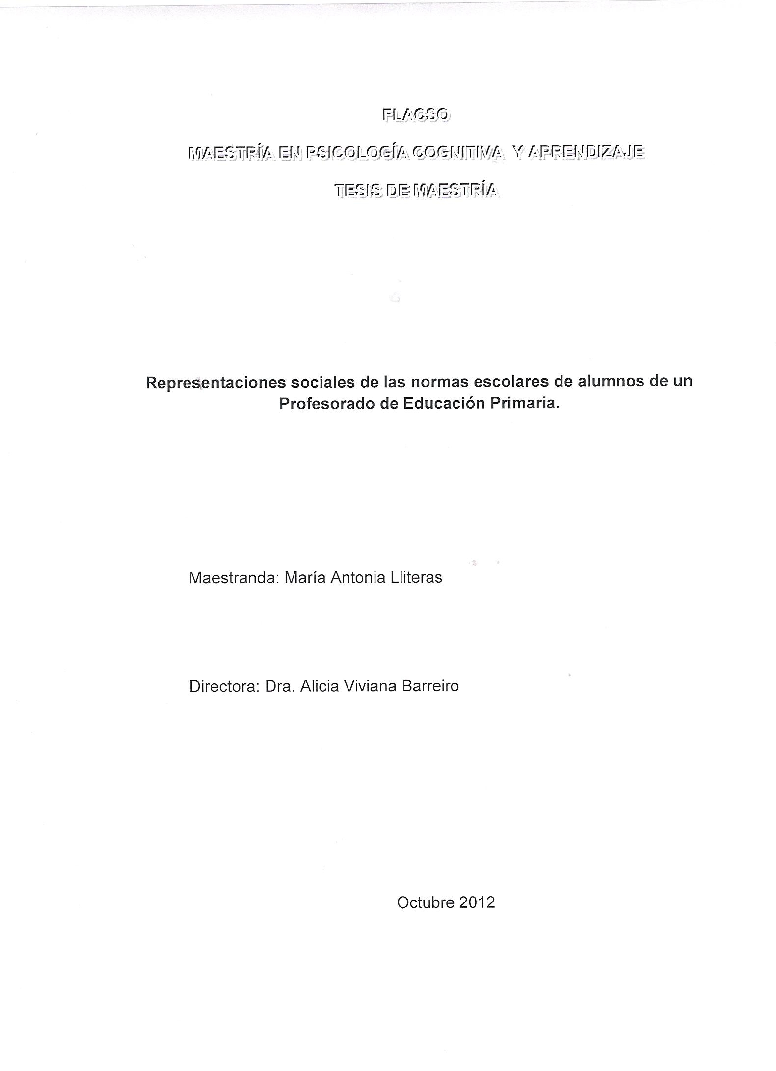 Lliteras, María Antonia (2013). Representaciones sociales de las normas escolares de alumnos de un profesorado de educación primaria. Tesis de Maestría. FLACSO. Sede Académica Argentina, Buenos Aires.