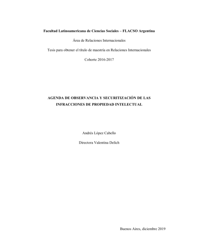 López Cabello, Andrés. (2019). Agenda de observancia y securitización de las infracciones de propiedad intelectual. Tesis de Maestría. FLACSO. Sede Académica Argentina, Buenos Aires.