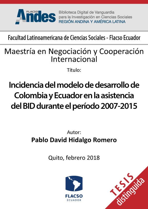 Hidalgo Romero, Pablo David. 2018. Incidencia del modelo de desarrollo de Colombia y Ecuador en la asistencia del BID durante el período 2007-2015. Tesis de maestría, Flacso Ecuador.