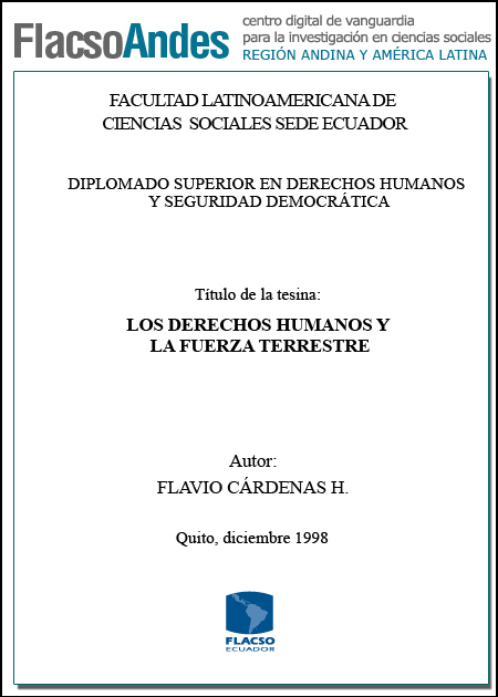 Cárdenas H., Flavio L. (1998). Los derechos humanos y la fuerza terrestre. Diploma superior en Derechos Humanos y Seguridad Democrática; FLACSO sede Ecuador. Quito. 62 p.
