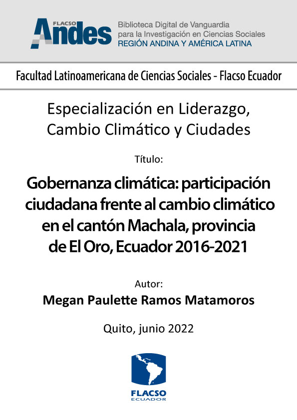 Ramos Matamoros, Megan Paulette. 2022. Gobernanza climática: participación ciudadana frente al cambio climático en el cantón Machala, provincia de El Oro, Ecuador 2016-2021. Tesina de especialización, Flacso Ecuador.