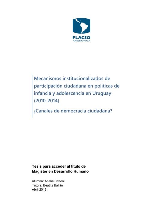 Bettoni Schafer, Analía (2016). Mecanismos institucionalizados de participación ciudadana en políticas de infancia y adolescencia en Uruguay (2010-2014) : ¿Canales de democracia ciudadana? Tesis de Maestría. FLACSO. Sede Académica Argentina, Buenos Aires.