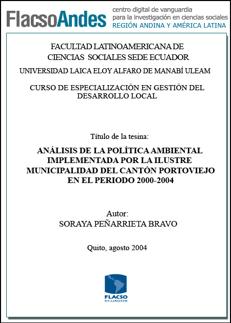 Peñarrieta Bravo, Soraya (2004). Análisis de la política ambiental implementada por la Ilustre Municipalidad del Cantón Portoviejo en el período 2000 – 2004. Programa de Políticas Públicas y Gestión, especialización en Gestión del Desarrollo Local; FLACSO - Sede Ecuador. Universidad Laica Eloy Alfaro de Manabí – ULEAM Portoviejo. 59 p.