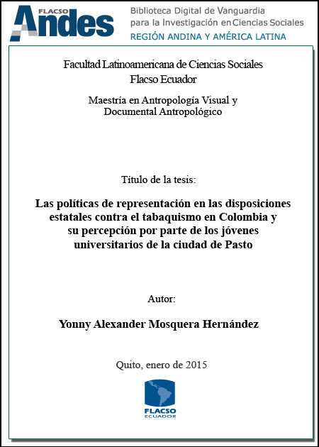 Mosquera Herández, Yonny Alexander. 2015. Las políticas de representación en las disposiciones estatales contra el trabaquismo en Colombia y su percepción por parte de los jóvenes universitarios de la ciudad de Pasto. Tesis de maestría, Flacso Ecuador.