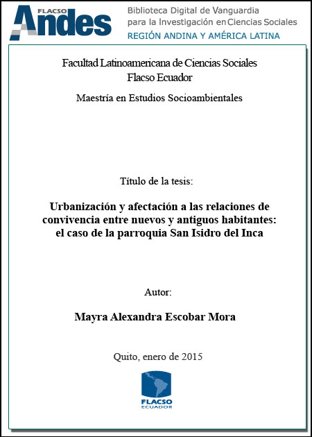 Escobar Mora, Mayra Alexandra. 2015 Urbanización y afectación a las relaciones de convivencia entre nuevos y antiguos habitantes: el caso de la parroquia San Isidro del Inca. Tesis de maestría, Flacso Ecuador.