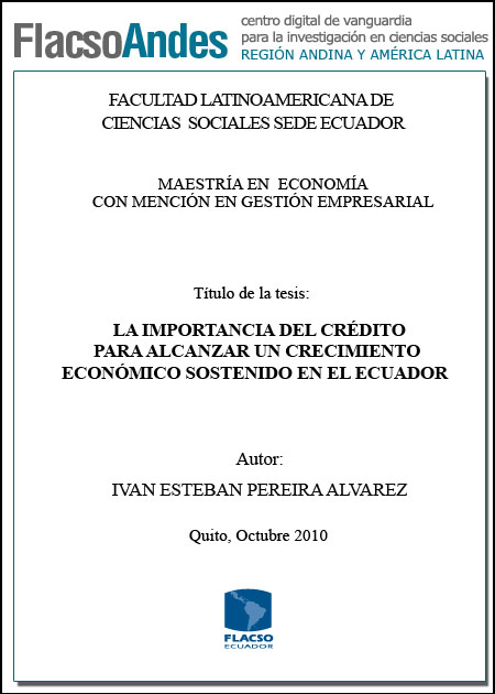Pereira Álvarez, Iván Esteban (2010). La importancia del crédito para alcanzar un crecimiento económico sostenido en el Ecuador. Maestría en Economía con mención en Gestión Empresarial; FLACSO - Sede Ecuador. Quito. 62 p.