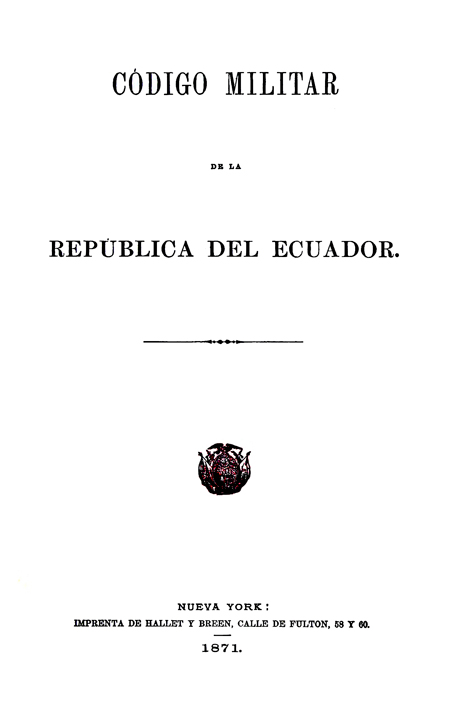 Convención Nacional del Ecuador. 1871. Código militar de la República del Ecuador: contiene además la "Reformas del Código Militar". Nueva York, Estados Unidos : Imprenta de Hallet y Breen.