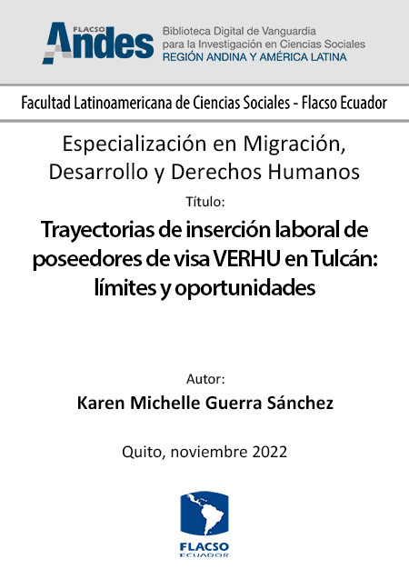 Guerra Sánchez, Karen Michelle. 2022. Trayectorias de inserción laboral de poseedores de visa VERHU en Tulcán: límites y oportunidades. Tesina de especialización, Flacso Ecuador.