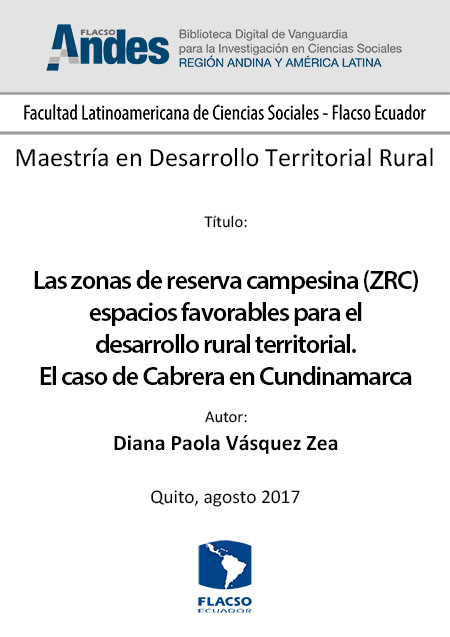 Vásquez Zea, Diana Paola. 2017. Las zonas de reserva campesina (ZRC) espacios favorables para el desarrollo rural territorial. El caso de Cabrera en Cundinamarca. Tesis de maestría, Flacso Ecuador.