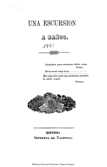 Salazar, Francisco Javier. 1855. Una escursión a Baños. Quito: Imprenta de Valencia.
