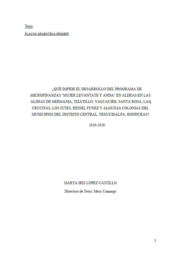 López Castillo, Marta Iris. (2021). ¿Qué impide el desarrollo del programa de microfinanzas "Mujer Levántate y Anda" en las aldeas de Germania, Tizatillo, Yaguacire, Santa Rosa, Las Crucitas, Los Jutes, Reinel Funez y algunas colonias del municipio del Distrito Central, Tegucigalpa, Honduras?. Tesis de Maestría. FLACSO. Sede Académica Argentina, Buenos Aires.