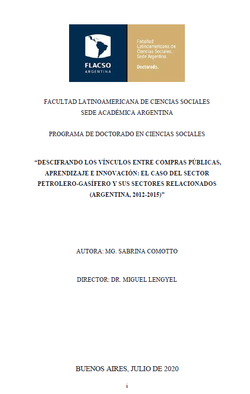 Comotto, Sabrina. (2020). Descifrando los vínculos entre compras públicas, aprendizaje e innovación : el caso del sector petrolero-gasífero y sus sectores relacionados (Argentina, 2012-2015). Tesis de Doctorado. FLACSO. Sede Académica Argentina, Buenos Aires.