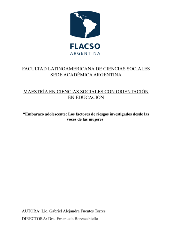 Fuentes Torres, Gabriel Alejandra (2024). Embarazo adolescente: los factores de riesgos investigados desde las voces de las mujeres. Tesis de Maestría. FLACSO. Sede Académica Argentina.