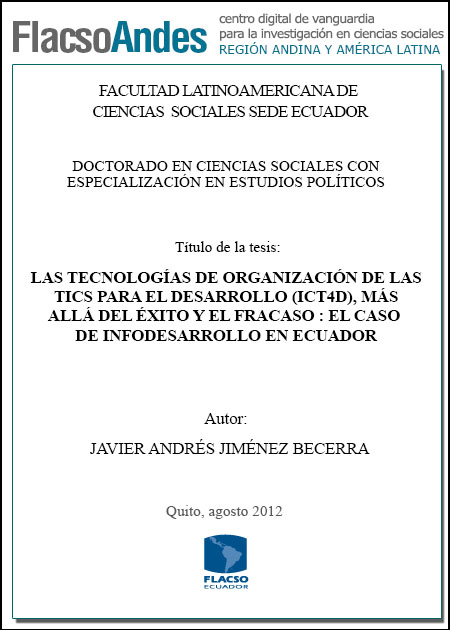 Jiménez Becerra, Javier Andrés (2012). Las tecnologías de organización de las TICS para el desarrollo (ICT4D), más allá del éxito y el fracaso : el caso de Infodesarrollo en Ecuador. Doctorado en Ciencias Sociales con especialización en Estudios Políticos; FLACSO Sede Ecuador. Quito, 325 p.