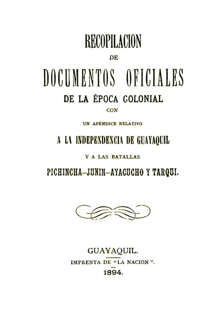 Recopilación de documentos oficiales e la época colonial con un apéndice relativo a la Independencia de Guayaquil y a las batallas Pichincha - Junín - Ayacucho y Tarqui.