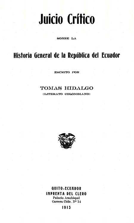 Hidalgo, Tomás. 1913. Juicio Crítico sobre la Historia General de la República del Ecuador. Quito, Ecuador : Imprenta del Clero.
