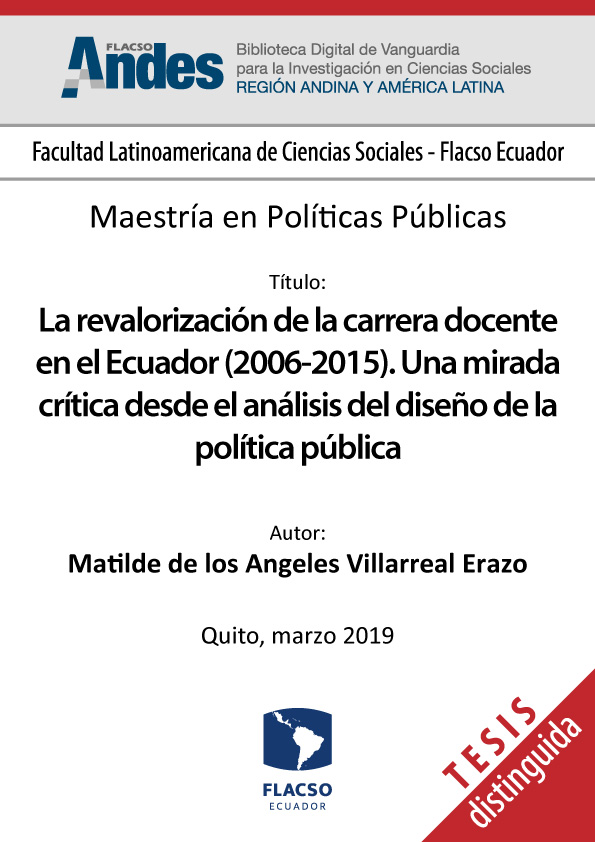 Villarreal Erazo, Matilde de los Angeles. 2019. La revalorización de la carrera docente en el Ecuador (2006-2015). Una mirada crítica desde el análisis del diseño de la política pública. Tesis de maestría, Flacso Ecuador.