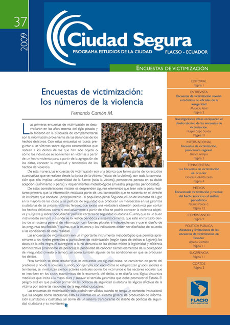 Ciudad segura. Encuestas de victimización: Los números de la violencia. FLACSO sede Ecuador. Programa de Estudios de la Ciudad. Quito: FLACSO, (no. 37, 2009): 12 p.