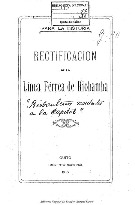 Para la historia : Rectificación de la línea férrea de Riobamba. Quito : Imprenta Nacional.