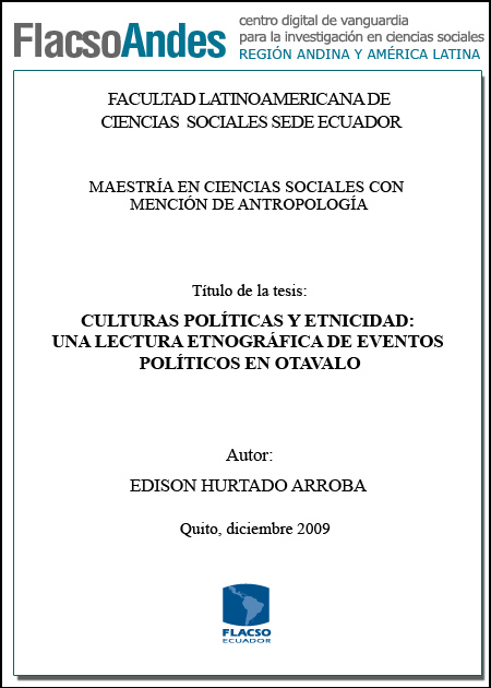 Hurtado Arroba, Edison (2009). Culturas políticas y etnicidad : una lectura etnográfica de eventos políticos en Otavalo, Maestría en Ciencias Sociales con mención en Antropología, FLACSO Sede Ecuador. Quito, 94 p.