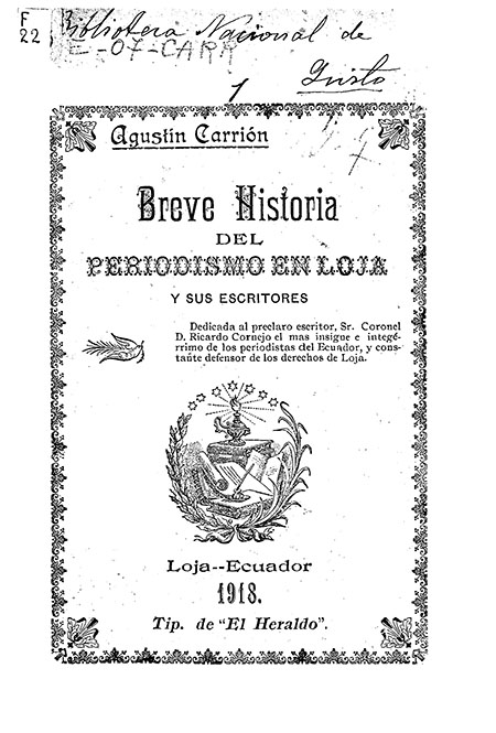 Carrión, Agustín. 1918. Breve historia del Periodismo en Loja y sus escritores. Loja : Tip. de El Heraldo