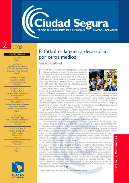 Ciudad segura. FLACSO sede Ecuador. Programa de Estudios de la Ciudad. Fútbol y violencias, Quito: FLACSO, (no. 21, septiembre 2007): 12 p.