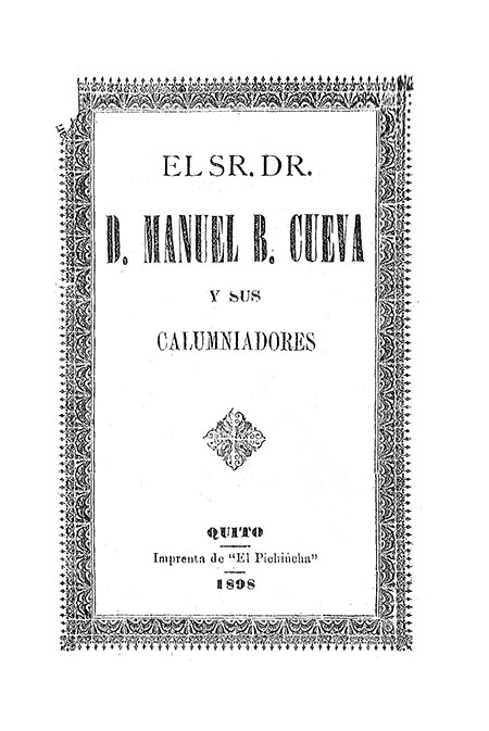 Amantes de la justicia. 1898. El Sr. Dr. D. Manuel Benigno Cueva y sus calumniadores. Quito : Imprenta de El Pichincha.