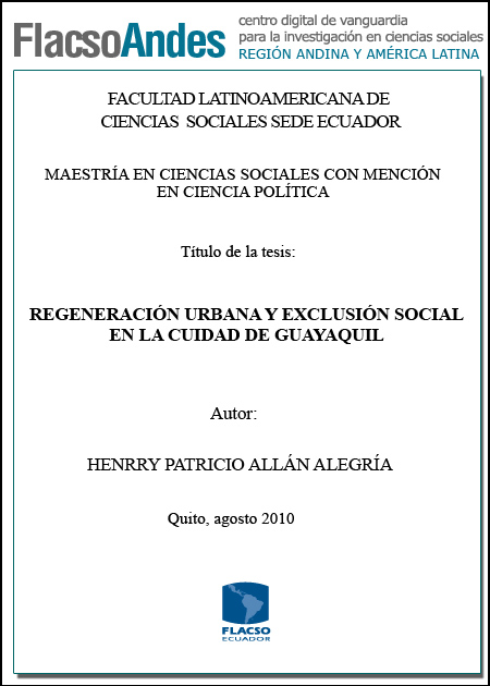 Allán Alegría, Henrry Patricio (2010). Regeneración urbana y exclusión social en la ciudad de Guayaquil. Maestría en Ciencias Sociales con mención en Ciencia Política; FLACSO - Sede Ecuador. Quito. 243 p.