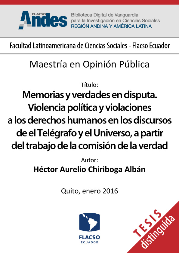 Chiriboga Albán, Héctor Aurelio. 2016. Memorias y verdades en disputa. Violencia política y violaciones a los derechos humanos en los discursos de el Telégrafo y el Universo, a partir del trabajo de la comisión de la verdad. Tesis de maestría, Flacso Ecuador.