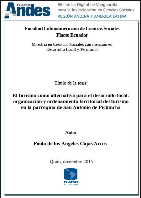 Cajas Arcos, Paola de los Ángeles. 2015. El turismo como alternativa para el desarrollo local. Organización y ordenamiento territorial del turismo en la parroquia de San Antonio de Pichincha. Tesis de maestría, Flacso Ecuador.