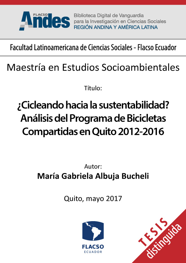 Albuja Bucheli, María Gabriela. 2017. ¿Cicleando hacia la sustentabilidad? Análisis del programa de bicicletas compartidas en Quito 2012-2016. Tesis de maestría, Flacso Ecuador.