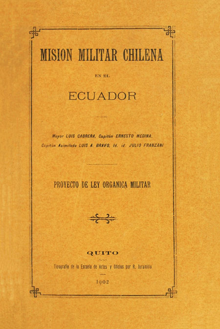 1902. Misión militar chilena en el Ecuador : Proyecto de Ley Orgánica Militar. Quito, Ecuador : Tipografía de la Escuela de Artes y Oficios por R. Jaramillo.
