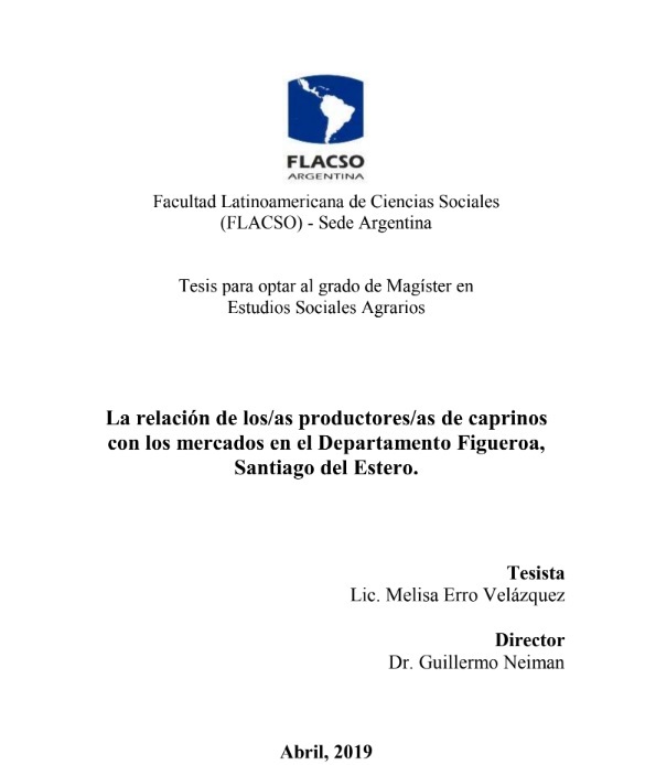 Erro Velázquez, Melisa Susana (2019). La relación de los/as productores/as de caprinos con los mercados en el Departamento Figueroa, Santiago del Estero. FLACSO. Sede Académica Argentina, Buenos Aires.