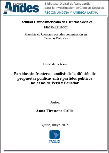 Firestone Callis, Anna. 2015. Partidos sin fronteras: análisis de la difusión de propuestas políticas entre partidos políticos: los casos de Perú y Ecuador. Tesis de maestría, Flacso Ecuador.