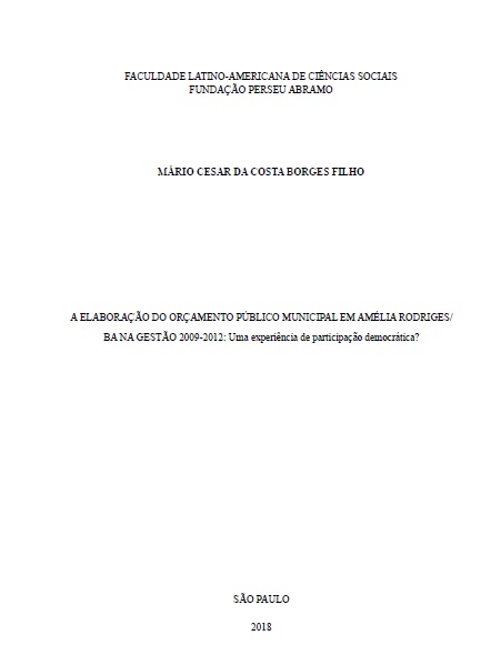 Costa Borges Filho, Mário Cesar da. 2018. Elaboração do orçamento público municipal em Amélia Rodrigues/BA na gestão 2009-2012: uma experiência de participação democrática?. Tesis de maestría, Flacso Brasil.