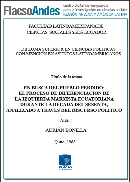 Bonilla, Adrian (1988). En busca del pueblo perdido : el proceso de diferenciación de la izquierda Marxista ecuatoriana durante la década del Sesenta, analizado a través del discurso político. Diploma Superior en Ciencias Políticas con Mención en Asuntos Latinoamericanos. FLACSO sede Ecuador. Quito. 215 p.