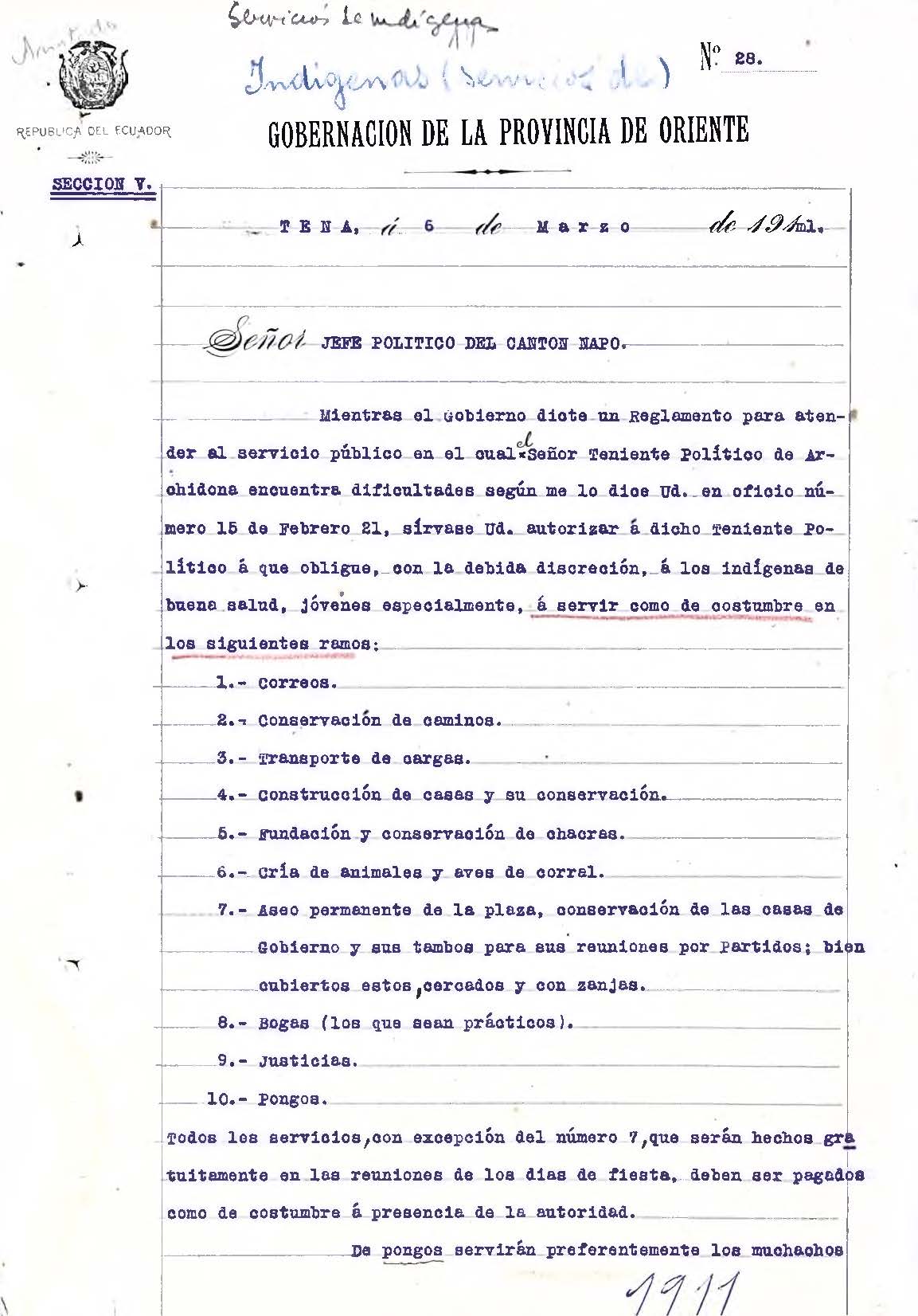 El sobre 13 contiene documentos donde se señala los servicios y actividades en las cuales se requiere del servicio de indígenas, varias de ellas relacionadas con el servicio público en carreteras o aseo de plazas. Así también se observa análisis o informes de los problemas que enfrenta la población amazónica y posibles soluciones por parte de autoridades. Además, se encuentran menciones a la “Propaganda ecuatorianista”, en el contexto de los conflictos limítrofes con el Perú y la necesidad de “ecuatorianizar a la población amazónica”. Por último, se recopila una circular de 1898 sobre la regulación y la protección del trabajo indígena y una denuncia sobre un intento de asesinato a una familia de propietarios por parte de indígenas. Años aproximados de los documentos: 1898, 1911, 1914, 1920, 1938.