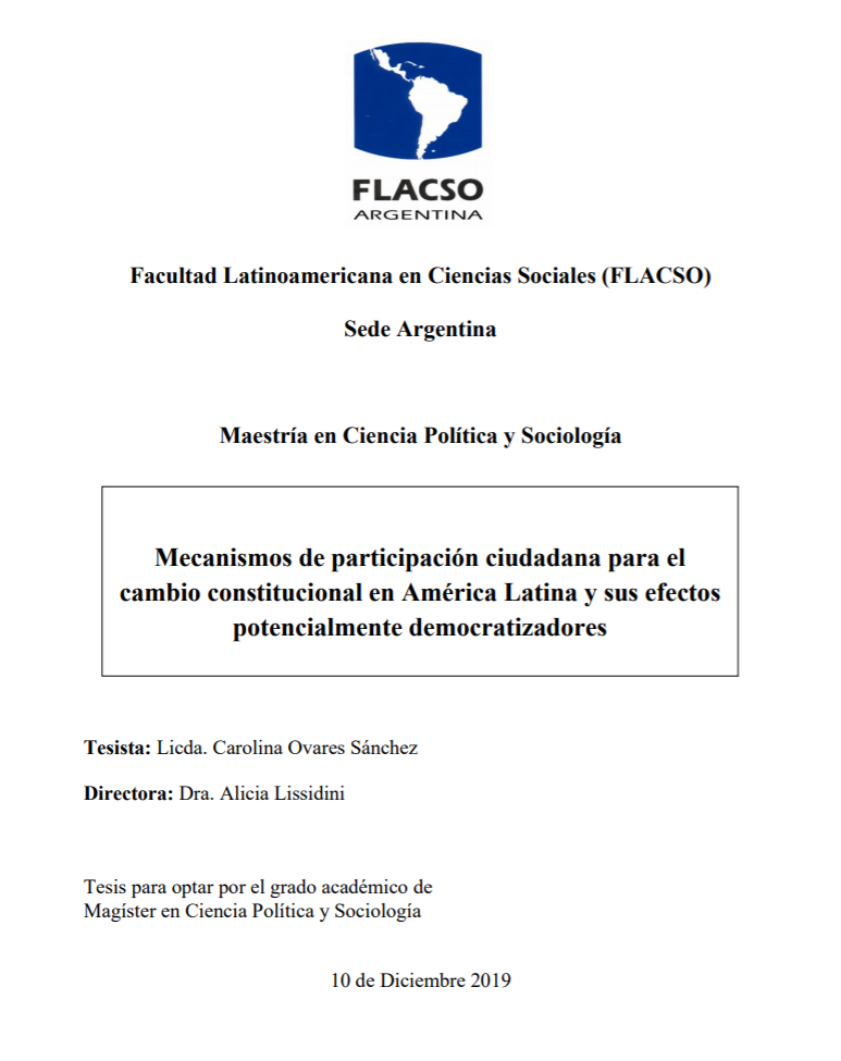 Ovares Sánchez, Carolina. (2019). Mecanismos de participación ciudadana para el cambio constitucional en América Latina y sus efectos potencialmente democratizadores. Tesis de Maestría. FLACSO. Sede Académica Argentina, Buenos Aires.