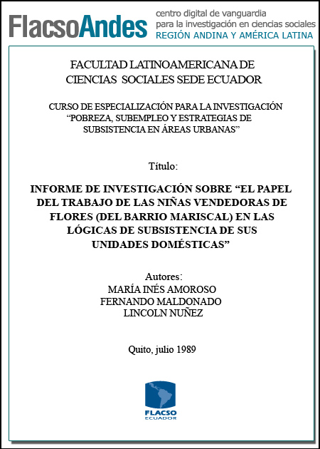 Amoroso, María Inés (1989). El papel del trabajo de las niñas vendedoras de flores (del barrio La Mariscal) en las lógicas de subsistencias de sus unidades domésticas. Especialización para la investigación de Pobreza, Subempleo y Estrategias de subsistencia en áreas urbanas; FLACSO sede Ecuador. Quito. 117 p.