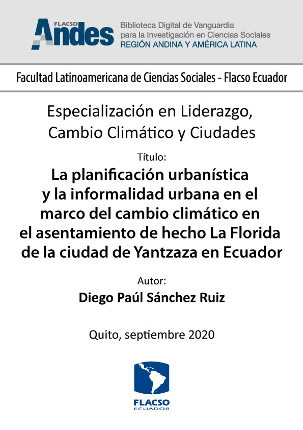 Sánchez Ruiz, Diego Paúl. 2020. La planificación urbanística y la informalidad urbana en el marco del cambio climático en el asentamiento de hecho La Florida de la ciudad de Yantzaza en Ecuador. Tesina de especialización, Flacso Ecuador.