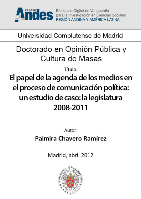 Chavero Ramírez, Palmira. 2012. El papel de la agenda de los medios en el proceso de comunicación política. Un estudio de caso: La legislatura 2008-2011. Tesis de doctorado, Universidad Complutense de Madrid.