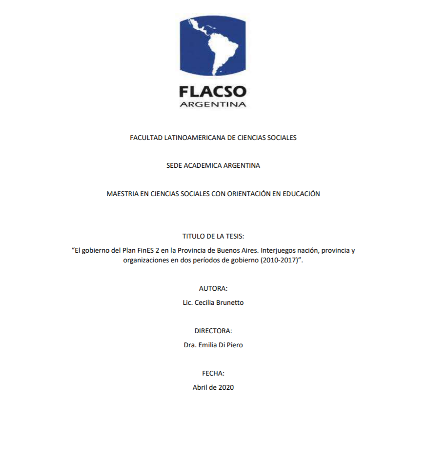 Brunetto, Cecilia. 2020. El gobierno del Plan FinES 2 en la Provincia de Buenos Aires : interjuegos nación, provincia y organizaciones en dos períodos de gobierno (2010-2017). Tesis de Maestría. FLACSO. Sede Académica Argentina, Buenos Aires.