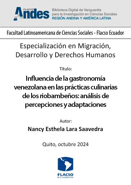 Lara Saavedra, Nancy Esthela. 2024. Influencia de la gastronomía venezolana en las prácticas culinarias de los riobambeños: análisis de percepciones y adaptaciones. Tesina de especialización, Flacso Ecuador.