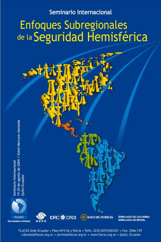 Afiche promocional del Seminario Internacional sobre Enfoques subregionales y seguridad hemisférica, realizado del 19 al 20 de agosto de 2004 en el Hotel Mercure - Alameda, con la colaboración de: FLACSO Sede Académica de Ecuador, OSPC, IDRC-CRDI, Banco del Pichincha, Embajada de Colombia y Embajada de Brasil.
