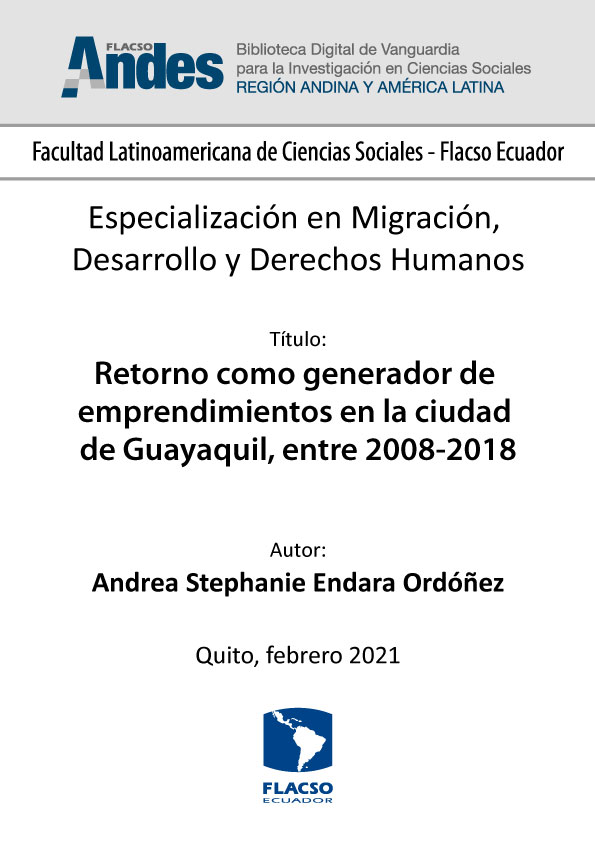Endara Ordóñez, Andrea Stephanie. 2021. Retorno como generador de emprendimientos en la ciudad de Guayaquil, entre 2008-2018. Tesina de especialización, Flacso Ecuador.