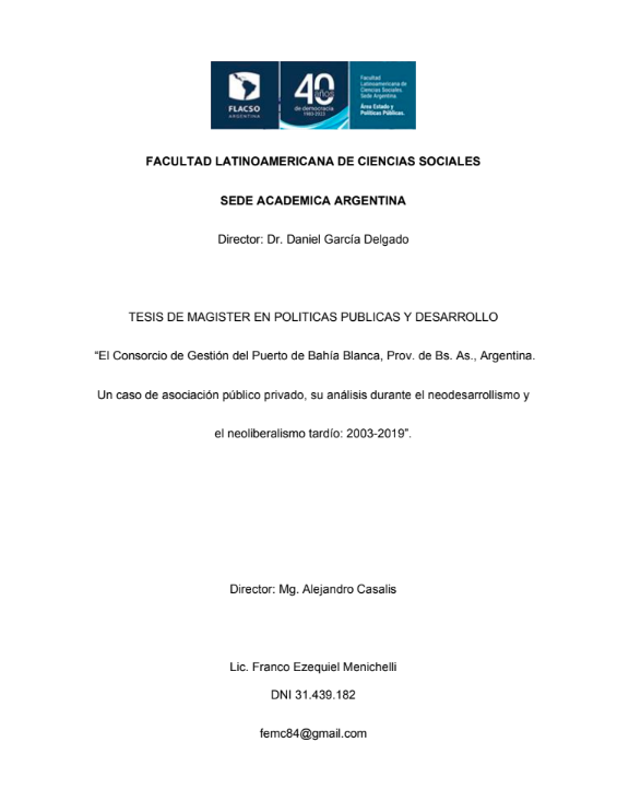 Menichelli, Franco Ezequiel (2023). El Consorcio de Gestión del Puerto de Bahía Blanca, Prov. de Bs. As., Argentina : un caso de asociación público privado, su análisis durante el neodesarrollismo y el neoliberalismo tardío : 2003-2019. Tesis de Maestría. FLACSO. Sede Académica Argentina, Buenos Aires.