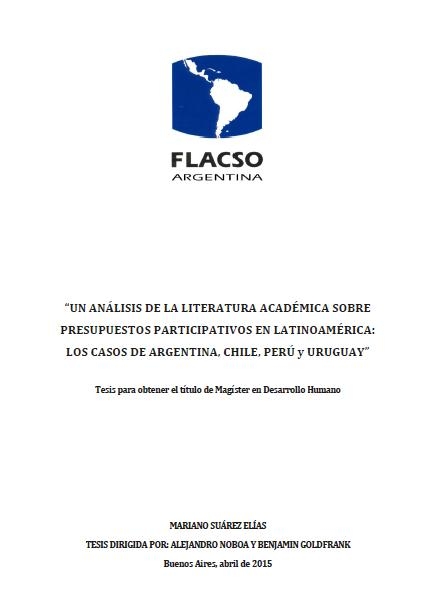 Suárez Elías, Mariano (2015). Un análisis de la literatura académica sobre presupuestos participativos en Latinoamérica : los casos de Argentina, Chile, Perú y Uruguay. Tesis de Maestría. FLACSO. Sede Académica Argentina, Buenos Aires.