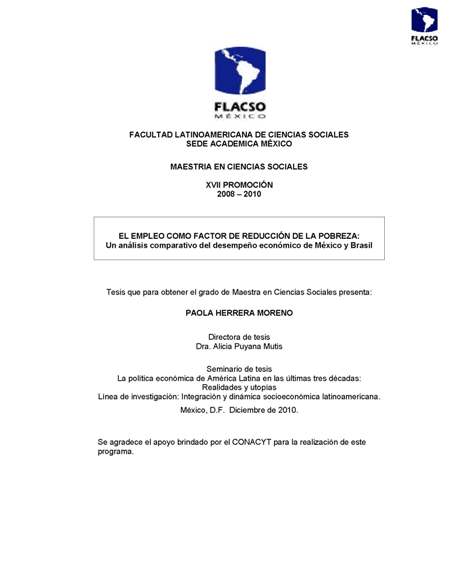 Herrera Moreno, Paola (2010). El empleo como factor de reducción de la pobreza : un análisis comparativo del desempeño económico de México y Brasil. Maestría en Ciencias Sociales; FLACSO México. México. 115 h.